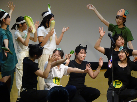 今回は、学生が主体となり企画、衣装の準備などを行い発表会に臨みました。演目は、3演目「ともだちほしいいなおおかみくん」「グリーンマントのピーマンマン」「くれよんのくろくん」あり、グループ毎にアレンジを加えて実施していました。