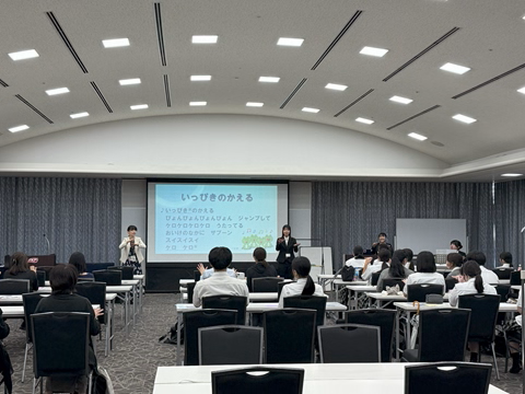 まずは、音楽教員による「手遊び」から始まり保育士関連科目を担当する教員による「ペープサート」が披露され、授業へと展開されました。