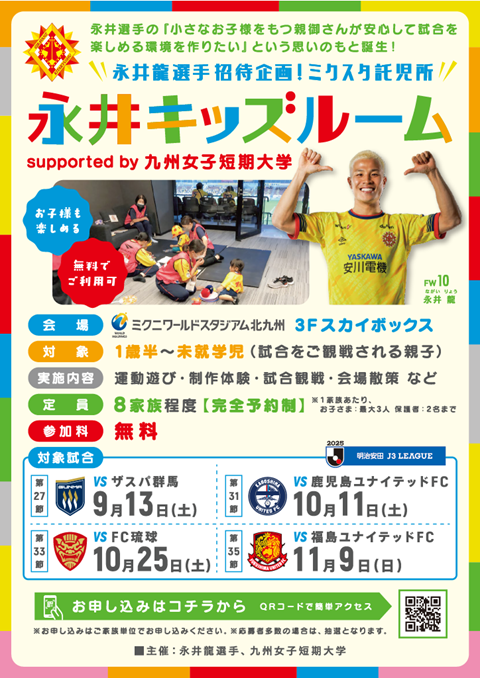 そして、2025シーズンは、2024シーズンに続きギラヴァンツ北九州の永井龍選手の『小さなお子様をもつ親御さんが安心して試合を楽しめる環境を作りたい』という思いのもと 、ホームゲーム4試合で開設する託児所は、永井龍選手のご招待企画として実施することとなりました。