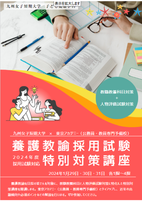 九州女子短期大学子ども健康学科では、学科での学びに加え、幅広い知識や技術を身につけることを目的として新たに3つの「教育プログラム」を令和6年度より導入します。この「教育プログラム」は、主となる専門分野に加え、興味のある異なる分野を深く学ぶことで柔軟な思考を身につけることが可能です。「教育プログラム」を修得することで、多様な知識や技術を得ることができ就職活動に活かすことができます。