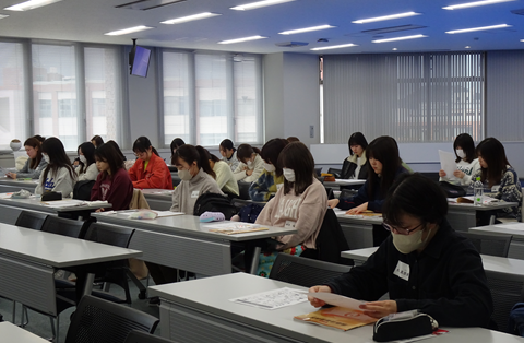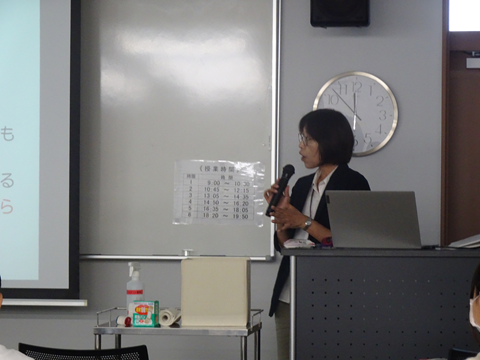 その後、学生による学科紹介が行われました。スライドをもとに学生生活の説明を行いました。2年生が実習で不在のため今年度4月に入学したばかりの1年生が頑張って説明を行いました。また、新教育プログラムの異文化プログラムを受講している学生が「韓国語」のレッスンをする場面も紹介されました。