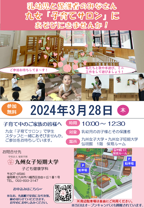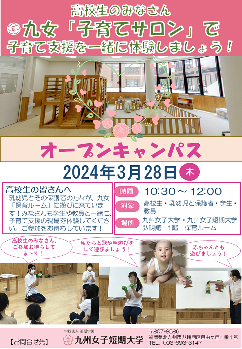 また、本学では8月24日のオープンキャンパスにて「第2回子育てサロン」を開催いたします。ぜひ、乳幼児とその保護者を対象としておりますので、ぜひご参加ください。大学構内の保育ルームを開放して行っております。