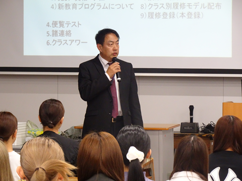 4月9日(火)午前中新入生を対象に、教務ガイダンスが行われました。最後の「学生便覧テスト」に向けて、短期大学部長の船津先生よりお言葉がありました。