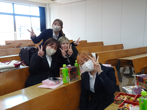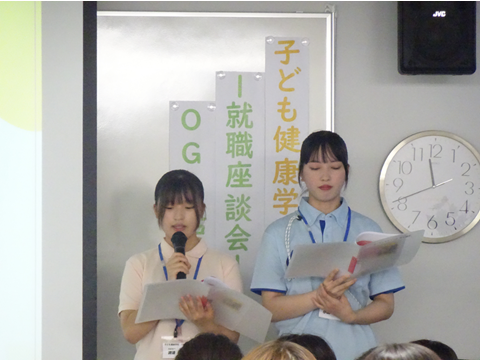 九州女子短期大学を卒業し、現場で活躍している卒業生にインタビュー形式で座談会を実施いたしました。第1回目は、今年の春に卒業し就職したばかりの卒業生2名からお話をうかがいました。今回は、最後に「グループトーク」を取り入れ、就職のお話だけでなく高校生の疑問に答えるかたちで進めれました。将来、目指す小公卿についてイメージすることができたと思います。