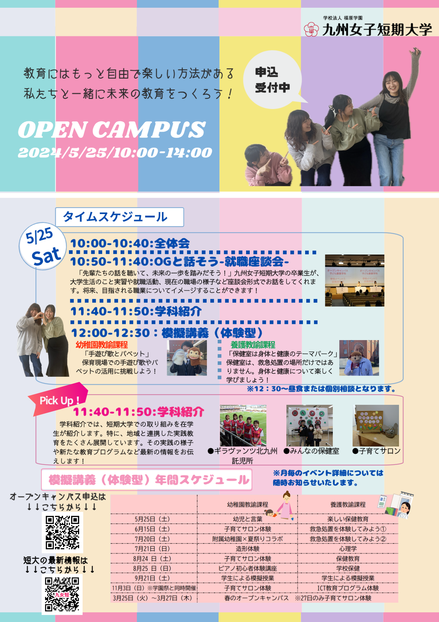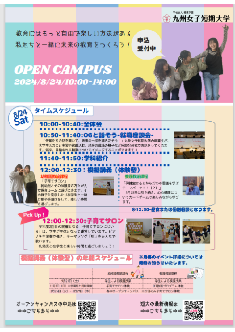 この九州女子大学附属幼稚園自由ヶ丘幼稚園とコラボ企画として生まれた「夏まつり」は、①実際に子どもに会えること ②本学は3園附属幼稚園がありますが様子を見学することで、入学後のサポート体制が充実していること ③子どもと一緒に体験できるなど魅力がたくさんあります。子どもと参加者の皆様と一緒に夏の思い出を作りましょう!