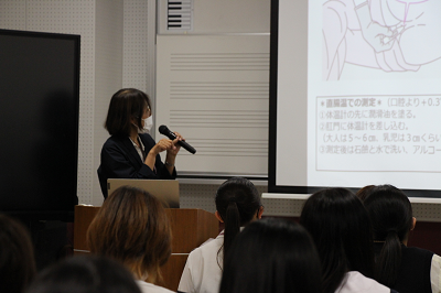 学校で生じるけがや病気に対して、適切な判断をするために子どもの健康レベルと身体のどこに何が生じている可能性があるのかをできるだけ客観的に把握することが必要です。フィジカルアセスメント(身体の状態を把握すること)に必要なバイタルサインについて学びました。参加者の皆様、自分の将来像を意識して熱心に取り組まれていました。