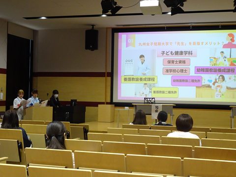 九州女子短期大学を卒業し、現場で活躍している卒業生にインタビュー形式で座談会を実施いたしました。第2回目は、卒業生から、養護教諭や一般就職された3名の卒業生から話をうかがえました。今回は、第1回目の時にはなかった「グループトーク」を取り入れ、就職のお話だけでなく高校生の疑問に答えるかたちで進めました。高校生からたくさんの質問をいただき、大変有意義な時間となりました。