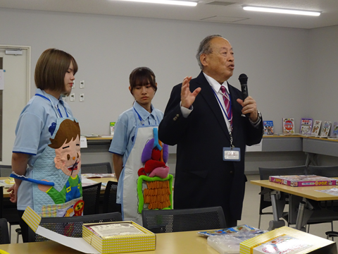 保健室は救急処置の場だけではありません。健康教育をご専門とされる住田先生が身体にまつわる様々な教材(書籍、絵本、教科書、エプロンシアターなど)をたくさん展示され、様々な視点から保健室について語られていました。参加された皆さんは、教材はもちろん聴診器などについて興味を持っておられました。