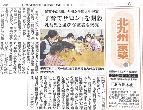 6月15日のオープンキャンパスで開設された九州女子短期大学「子育てサロンにじいろ」の取り組みが、本日6月16日付の西日本新聞に掲載されました。