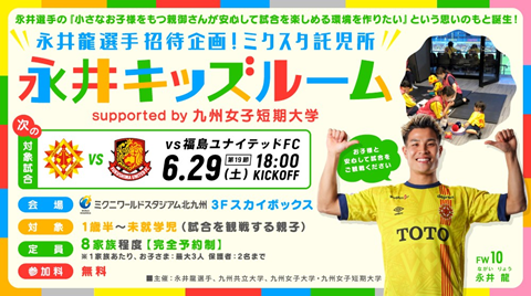 そして、2024シーズンは、ギラヴァンツ北九州の永井龍選手の『小さなお子様をもつ親御さんが安心して試合を楽しめる環境を作りたい』という思いのもと 、ホームゲーム4試合で開設する託児所は、永井龍選手のご招待企画として実施することとなりました。