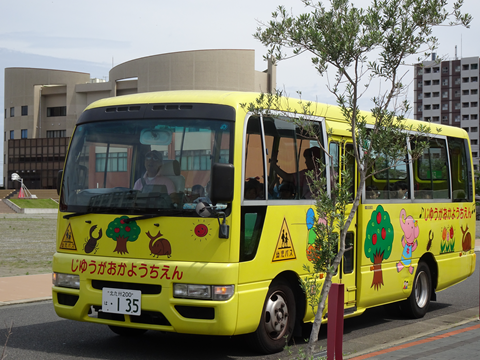 さぁ!幼稚園のバスが到着しました。いよいよ「夏祭り」の開始です。バスから、最初にバスから降りてきたのは、本学の卒業生で自由ケ丘幼稚園の幼稚園教諭です。