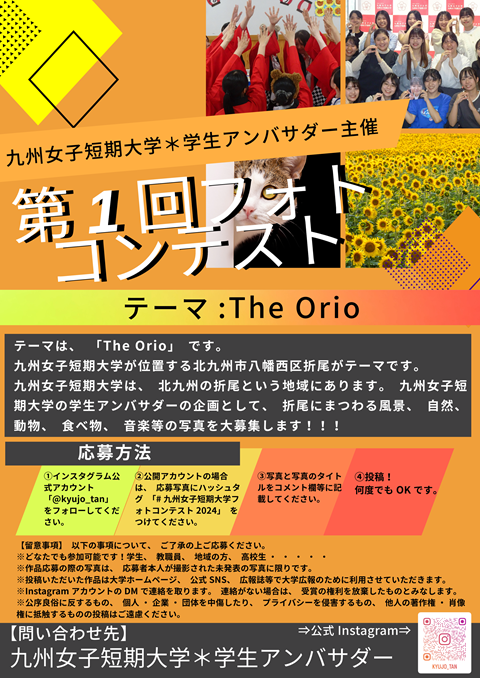 九州女子短期大学は、北九州の折尾という地域にあります。九州女子短期大学の学生アンバサダーの企画として、折尾にまつわる風景、自然、動物、食べ物、音楽等の写真を大募集します!!!