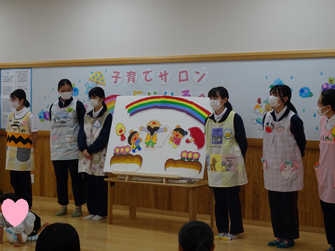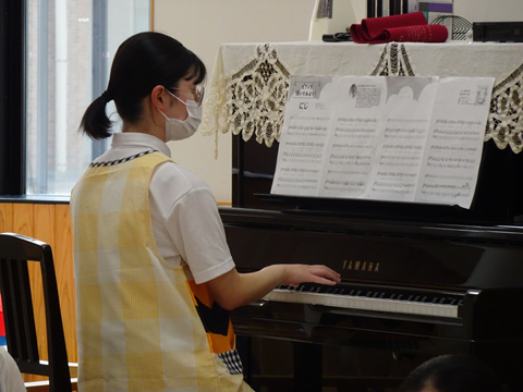 ピアノも生演奏で弾いています。最後は、テーマソング「虹」をみんなで歌って終わりました。本日の開催まで、たくさんの準備や練習をして臨んだ学生のみなさんお疲れ様でした。また、サロンに参加していただいた乳幼児とその保護者の皆様、オープンキャンパスの参加者の皆様ありがとうございました。