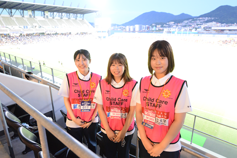 6月29日(土曜日)は、ギラヴァンツ北九州VS福島ユナイテッドFCとのホーム試合が開催されました。その際、九州女子短期大学 専攻科生が中心となって託児所を開催いたしました。今年度で4年目となる取り組みですが、今年は大幅に内容がリニューアルされ、永井龍選手の招待企画「永井キッズルーム supported by 九州女子短期大学」として実施されました。