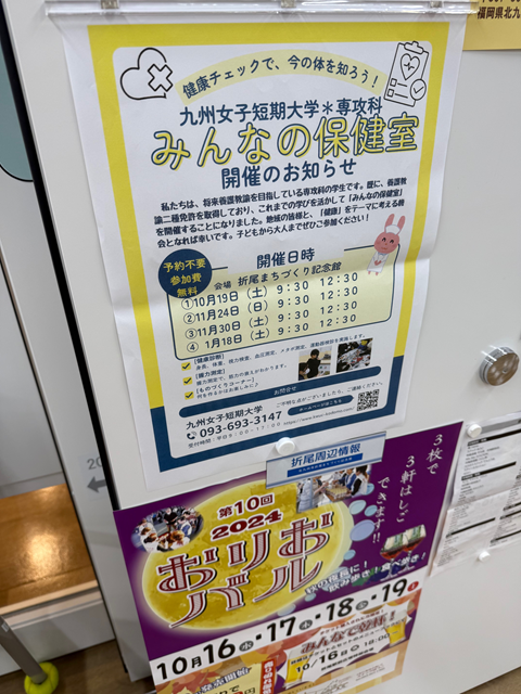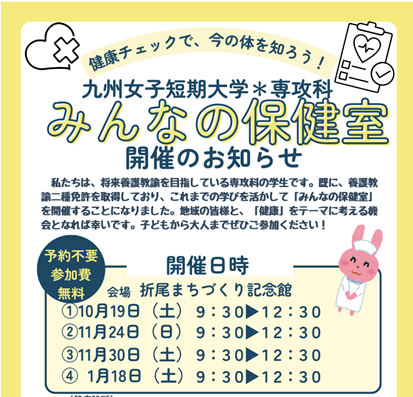 本日19日(土)、折尾まちづくり記念館において専攻科学生による「みんなの保健室」を実施いたしました。この「みんなの保健室」、専攻科の学生の学びの一環として展開しています。短期大学において、すでに養護教諭二種免許を取得しています。
