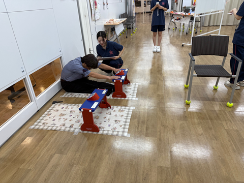学生は、小さい子どもに対してもわかりやすい言葉で説明しており、子どもも楽しそうに実施していました。また、1年生と2年生が交流することができたようで、大変盛り上がって良い雰囲気でした。