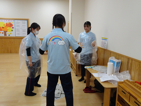 今回も保育士免許と養護教諭二種免許を既に取得している専攻科の学生も参加してくれました。この様子は、嘔吐物処理に備えて準備をしているところです。また、救急箱も用意して万全の体制で子育てサロンに臨んでいました。