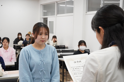 昨年度からの第1期生5名に加えて、第2期生が32名が活動することになりました。短期大学部長から、任命の言葉をいただき、「任命状」の交付が行われました。