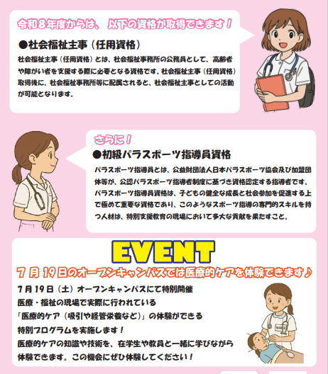 さらに、子ども健康学科では令和8年度入学生より「新教育課程」がスタートします。大きくは、社会福祉主事(任用資格)と初級パラスポーツ指導員資格が取得できます。