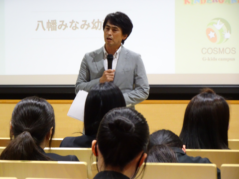 まずは、「北九州市私立幼稚園連盟」による就職説明会からスタートしました。就職フェアの案内や園長先生やその幼稚園に勤務する幼稚園教諭の先生からのお話も聞け、学生にとっては進路選択の1つとなったようです。