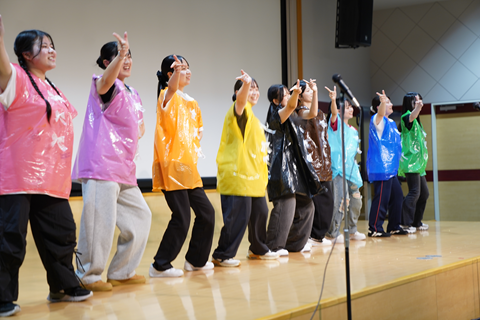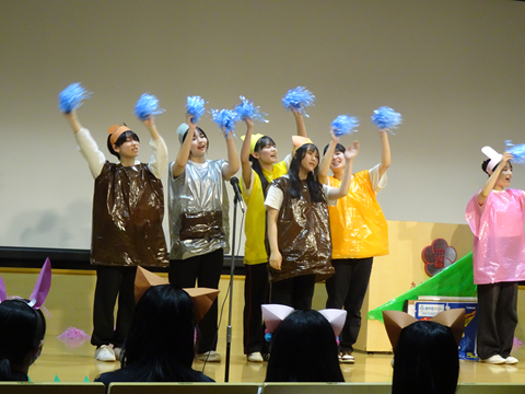 今回は、学生が主体となり企画、衣装の準備などを行い発表会に臨みました。演目は、3演目「ともだちほしいいなおおかみくん」「グリーンマントのピーマンマン」「くれよんのくろくん」あり、グループ毎にアレンジを加えて実施していました。