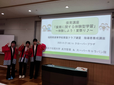 福岡県高校学校家庭クラブ連盟指導者養成講座として、高校生向けに講座を開催いたしました。保育士を目指すスーパーキャラバン隊の学生3名が中心となり、本学教員の貞方先生による講座を実施いたしました。